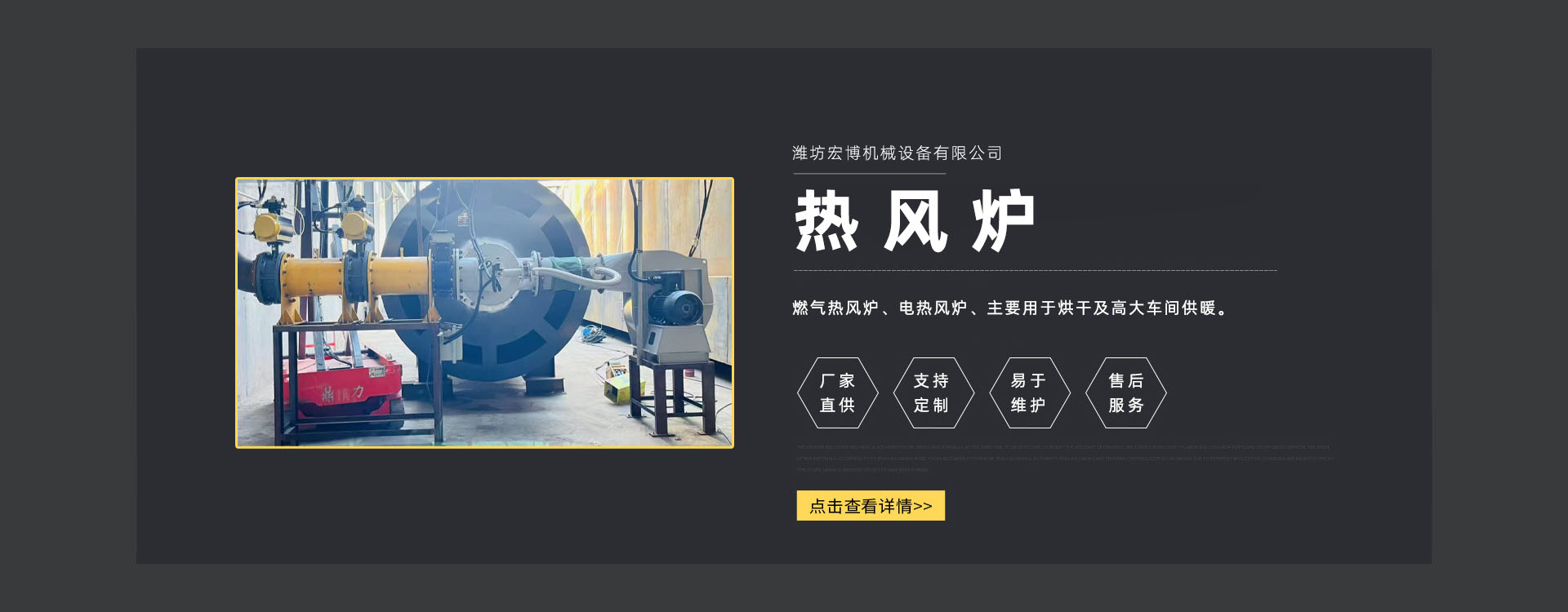 濰坊宏博機(jī)械設(shè)備有限公司是從事熱風(fēng)爐、烘干設(shè)備、供暖設(shè)備的研發(fā)、設(shè)計(jì)、制造和服務(wù)于一體的實(shí)體企業(yè)。長(zhǎng)期以來(lái),企業(yè)以市場(chǎng)的發(fā)展和客戶的需求為導(dǎo)向,集多年的生產(chǎn)技術(shù)與經(jīng)驗(yàn)為一體,不斷開(kāi)發(fā)和優(yōu)良產(chǎn)品。